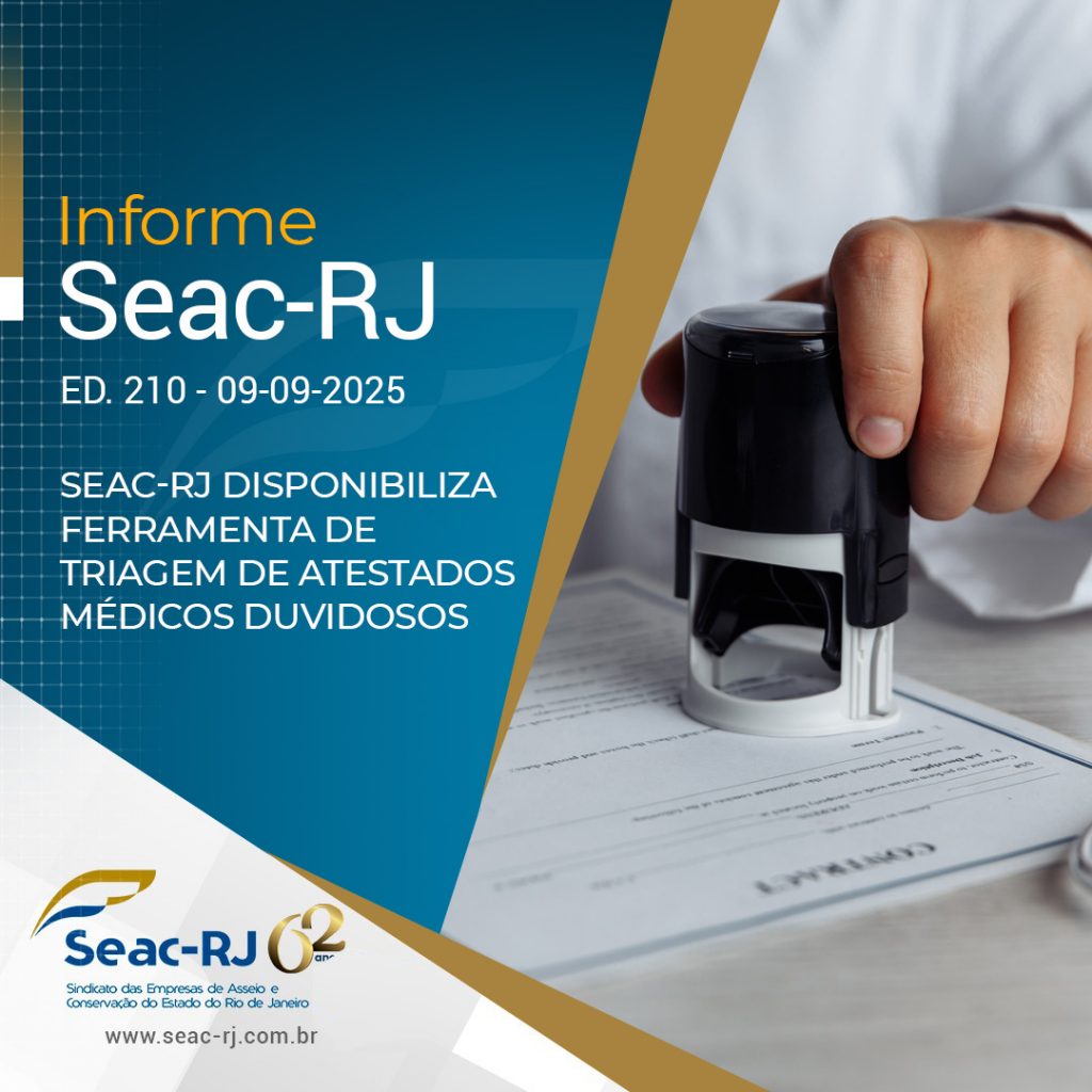 Comunicado Importante às Empresas do Setor representadas pelo SEAC-RJ: Ferramenta de Triagem de Atestados Médicos Duvidosos O SEAC-RJ informa que, em cumprimento ao previsto na Convenção Coletiva de Trabalho, as empresas do setor de asseio e conservação contam com o benefício social familiar e empresarial, que disponibiliza uma ferramenta exclusiva de triagem e verificação de […]