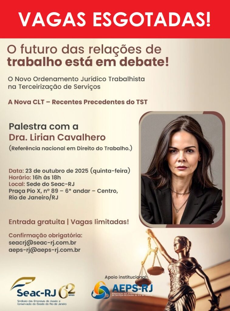 O SEAC-RJ e a AEPS-RJ informam que as inscrições para a palestra “A Nova CLT e os Recentes Precedentes do TST”, com a Dra. Lirian Cavalhero, estão encerradas devido à grande procura.