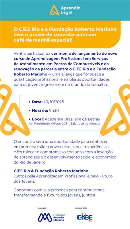 Participe da cerimônia de lançamento do novo Curso em Serviços de Atendimento em Postos de Combustíveis e da renovação da parceria entre o CIEE Rio e a Fundação Roberto Marinho — uma aliança que fortalece a qualificação profissional e amplia as oportunidades para os jovens ingressarem no mundo do trabalho.