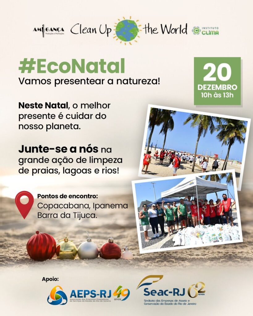 O Seac-RJ participa mais uma vez do evento EcoNatal 2025 – Verão Limpo 2026, que acontece ininterruptamente desde 2003 em várias localidades do Brasil, em sua 23ª edição consecutiva – que será realizada no sábado, dia 20 de dezembro, a partir das 10h em várias praias cariocas.