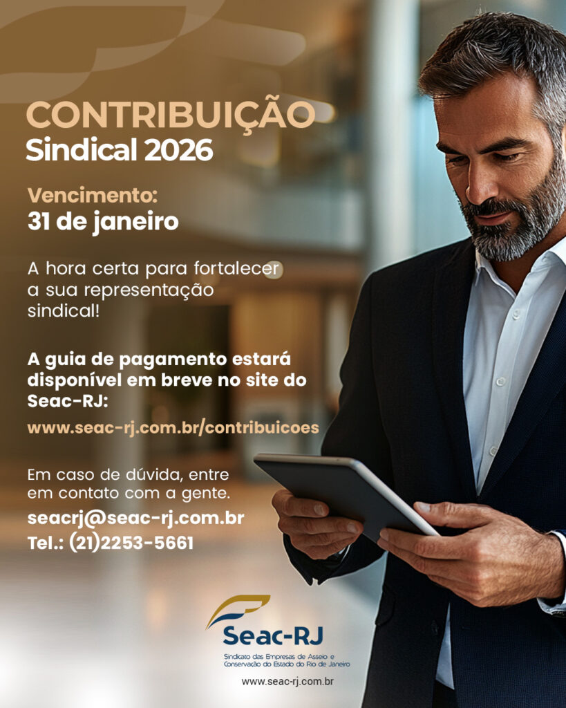 O Seac-RJ vai disponibilizar em breve no site da instituição, www.seac-rj.com.br a guia para o pagamento da Contribuição Sindical 2026, que vence no próximo dia 31 de janeiro.