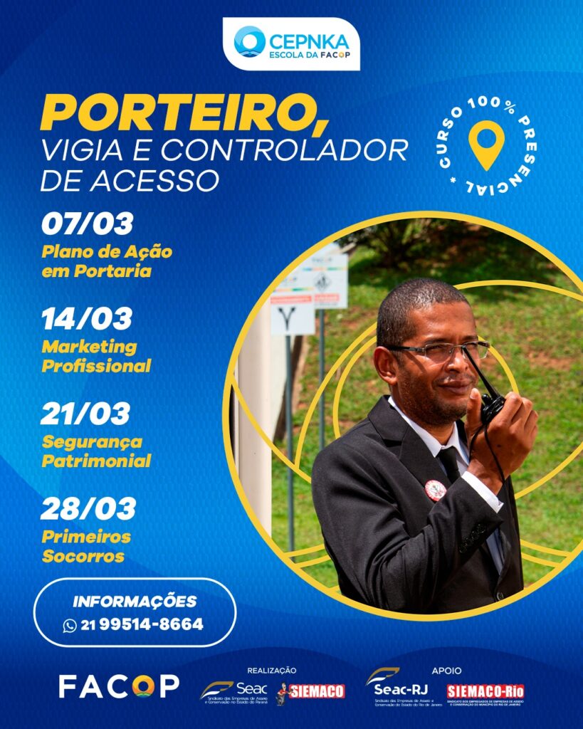 Para porteiro, vigia e controlador de acesso são três cursos: plano de ação em portaria, dia 7 de março; segurança patrimonial, dia 21 de março; e primeiros socorros, dia 28 de março.
