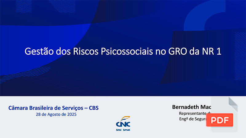 No que se refere à NR-1, O SEAC-RJ reenviou aos seus associados e filiados a Cartilha sobre a Gestão dos Riscos Psicossociais no GRO da NR-1, documento técnico elaborado pela advogada Bernadeth Macedo Vieira, engenheira de Segurança do Trabalho e representante da Confederação Nacional do Comércio de Bens, Serviços e Turismo (CNC), com orientações práticas para a adequada implementação do gerenciamento de riscos.