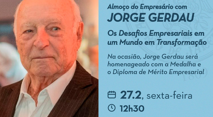 A ACRJ recebe, dia 27 de fevereiro, a partir das 12h30, o empresário Jorge Gerdau, que será o convidado especial do “Almoço do Empresário”. Na oportunidade, o presidente da Associação Comercial, Josier Vilar, vai homenageá-lo com a Medalha e o Diploma de Mérito Empresarial.